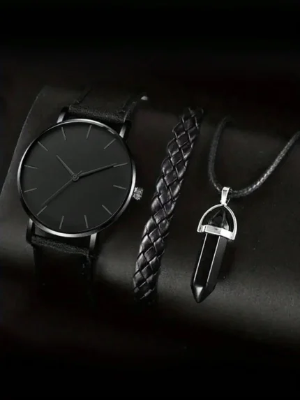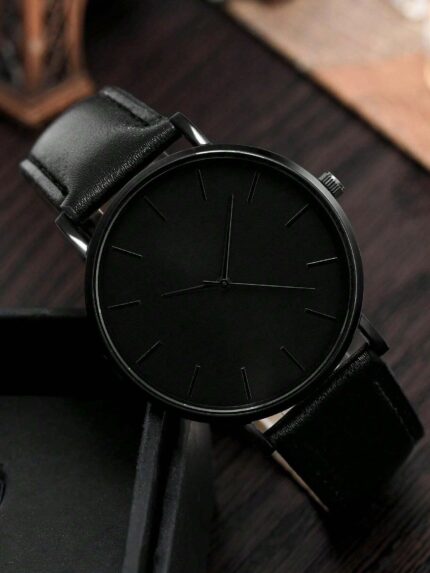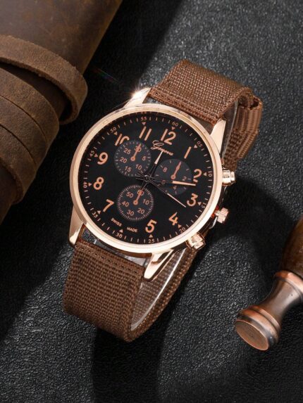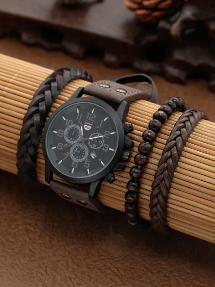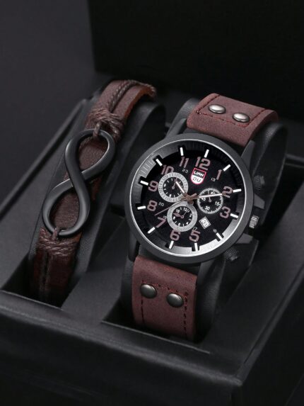Men 2pcs Brown Pu Leather Strap Watch and Bracelet