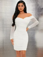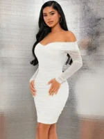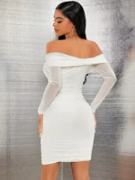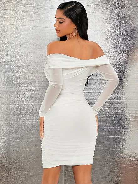 White Party Ruched Bodycon Off the Shoulder Long Sleeve Short Dress