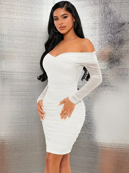 White Party Ruched Bodycon Off the Shoulder Long Sleeve Short Dress