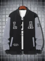 Colorblock, Letter Button Bomber Baseball Collar Long Sleeve Single Breasted Jacket