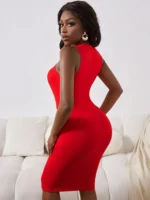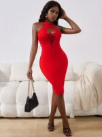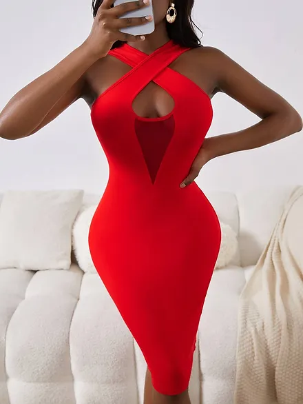 Red Sexy Contrast Mesh, Criss Cross Bodycon Sleeveless Dress