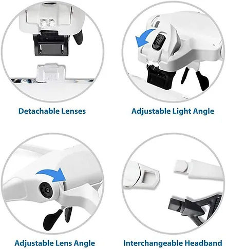 -Angle-adjustable magnifying glasses with 5 interchangeable lenses 1.0X, 1.5X, 2.0X, 2.5X, 3.5X magnification. Acrylic lens is scratch-resistant and lightweight.