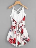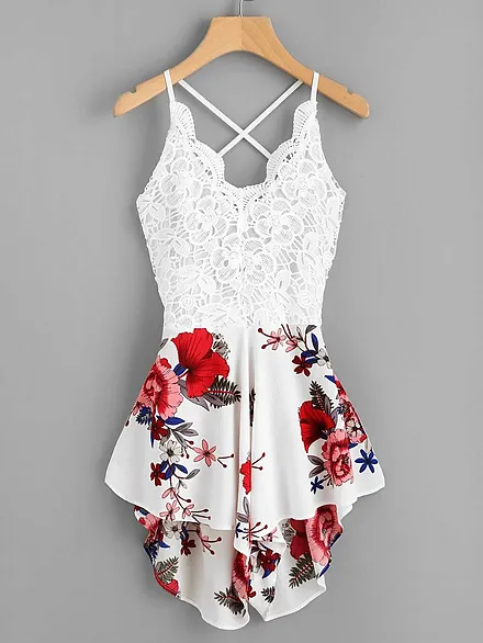 Boho Floral Contrast Lace, Asymmetrical, Backless, Criss Cross, Knot, Scallop, V neck, Spaghetti Strap Sleeveless Romper