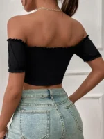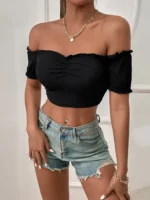 Black Sexy Off Shoulder, Lettuce Trim, Ruched, Rib-Knit Short Sleeve Top