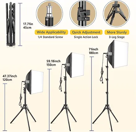 Softbox lighting kit is made of high-quality PET fabric and a foldable nylon cover, which has high reflectivity, softer and even light, and a wider range of illumination.